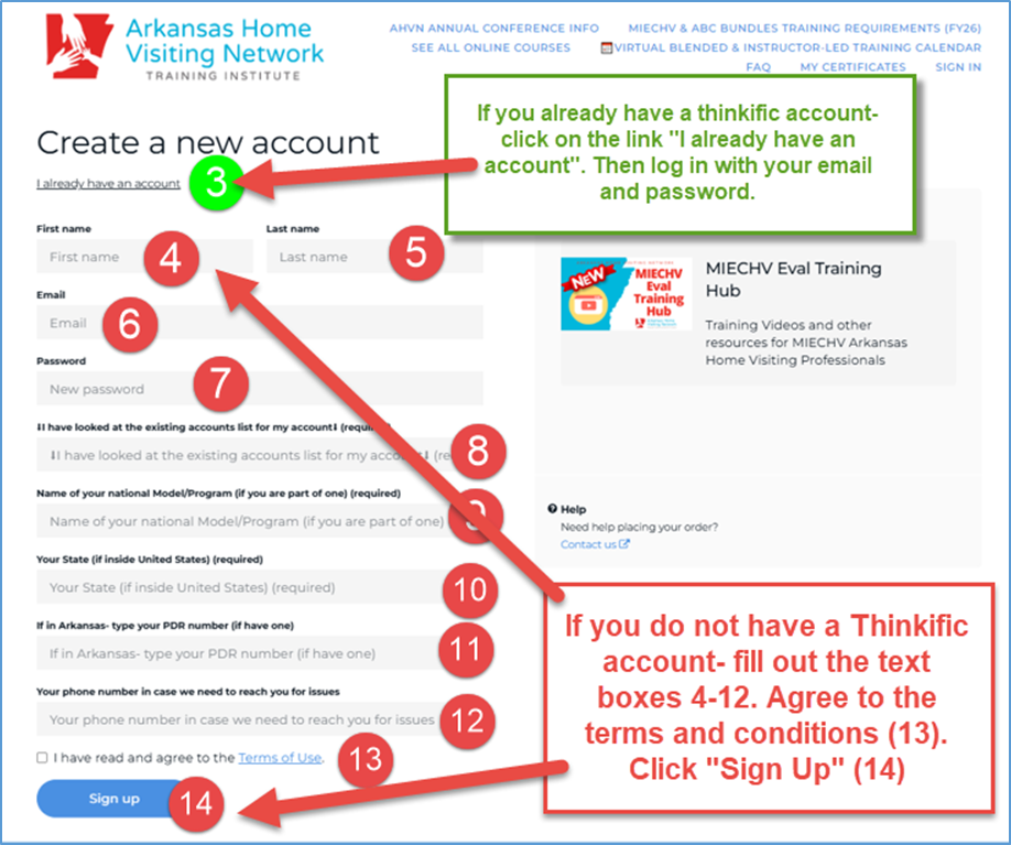 Registration Process to Enroll in the MIECHV Eval Training Hub on the AHVN Thinkific Website